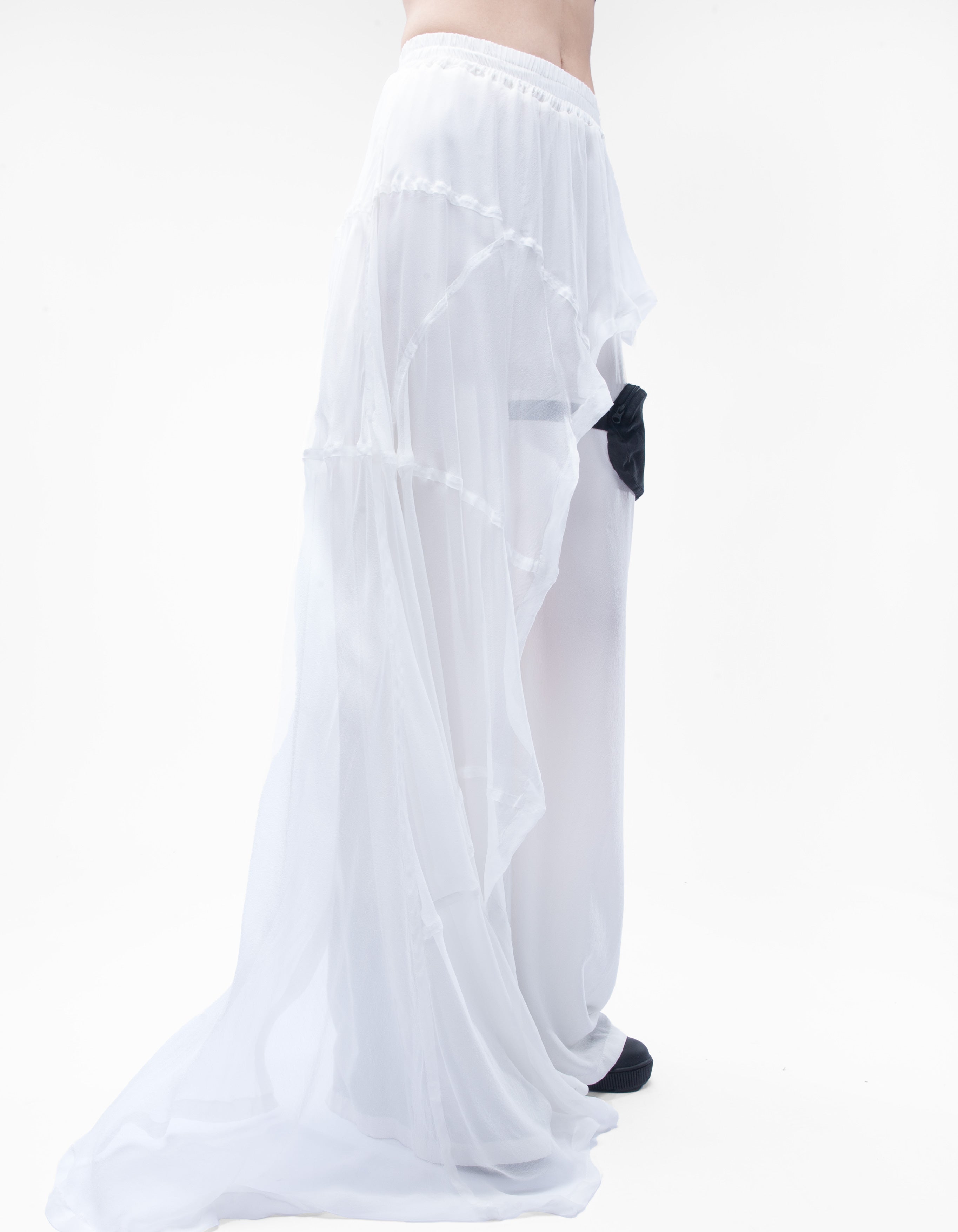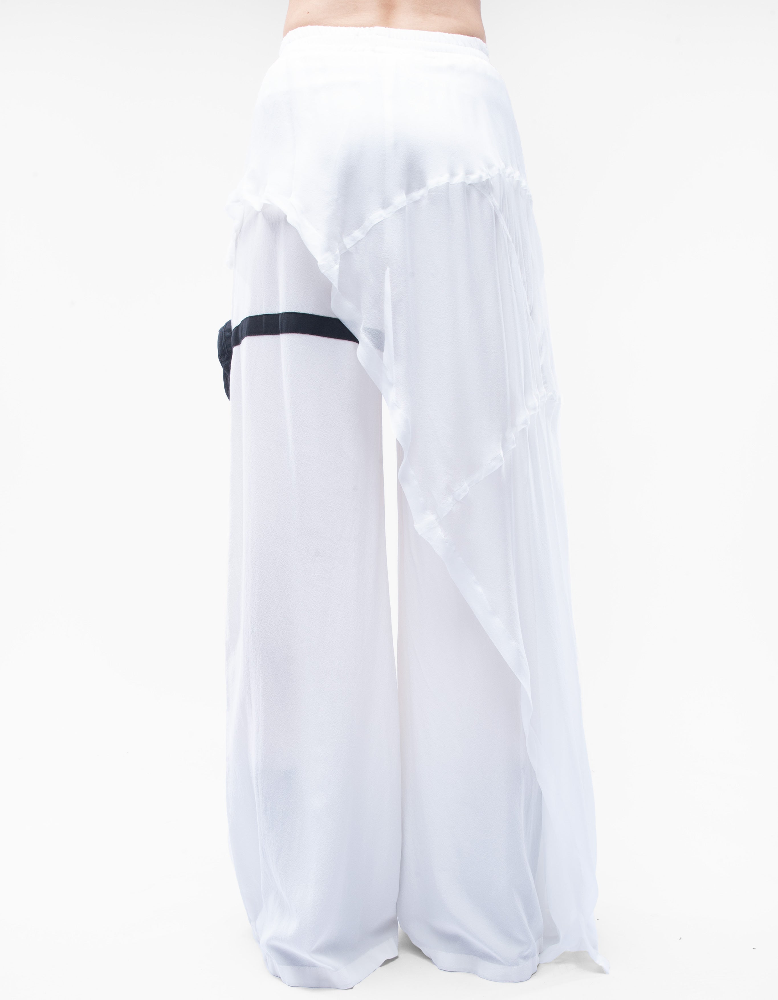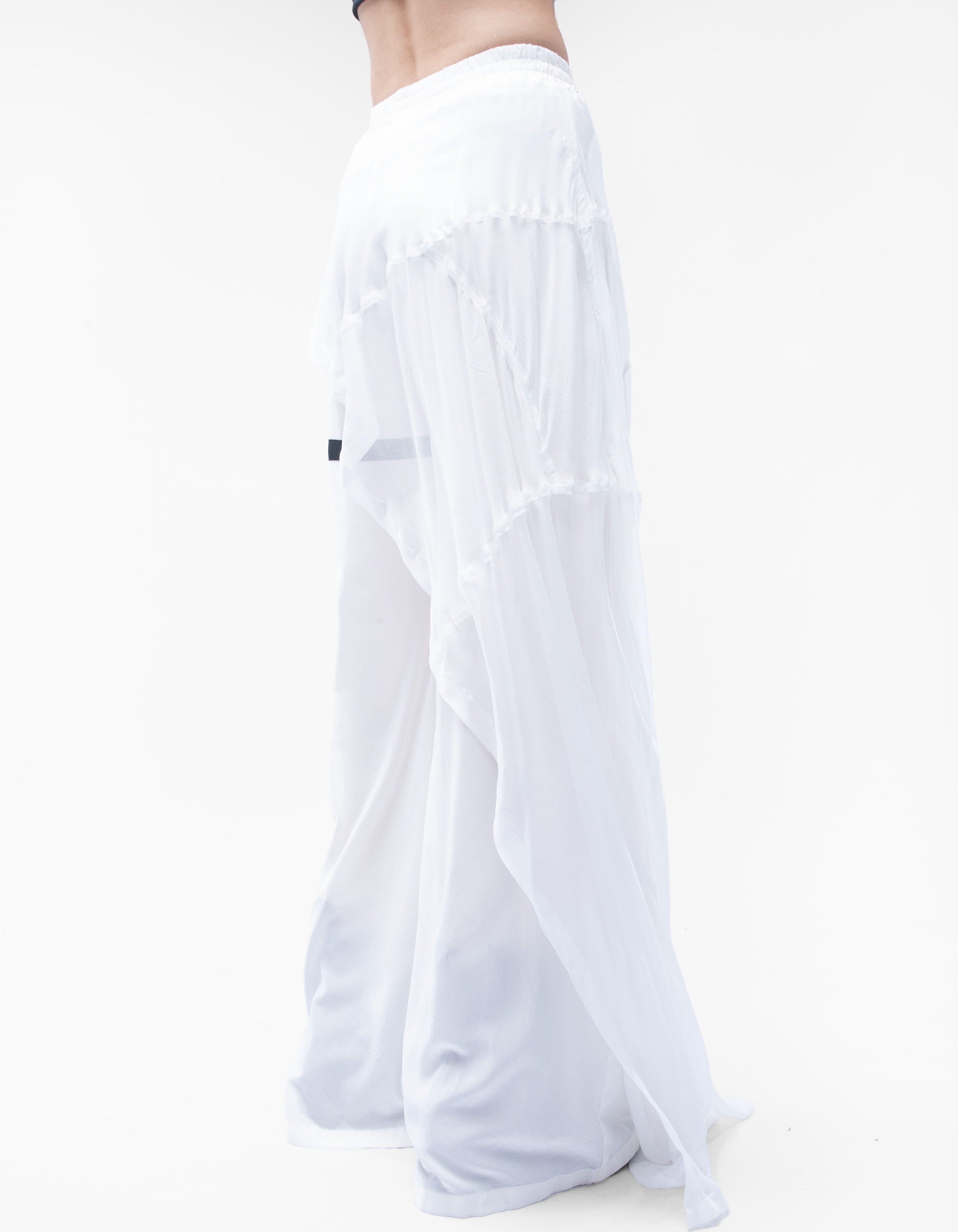 The trousers are slightly transparent.The length of the trousers is 104 cm from the high waist.