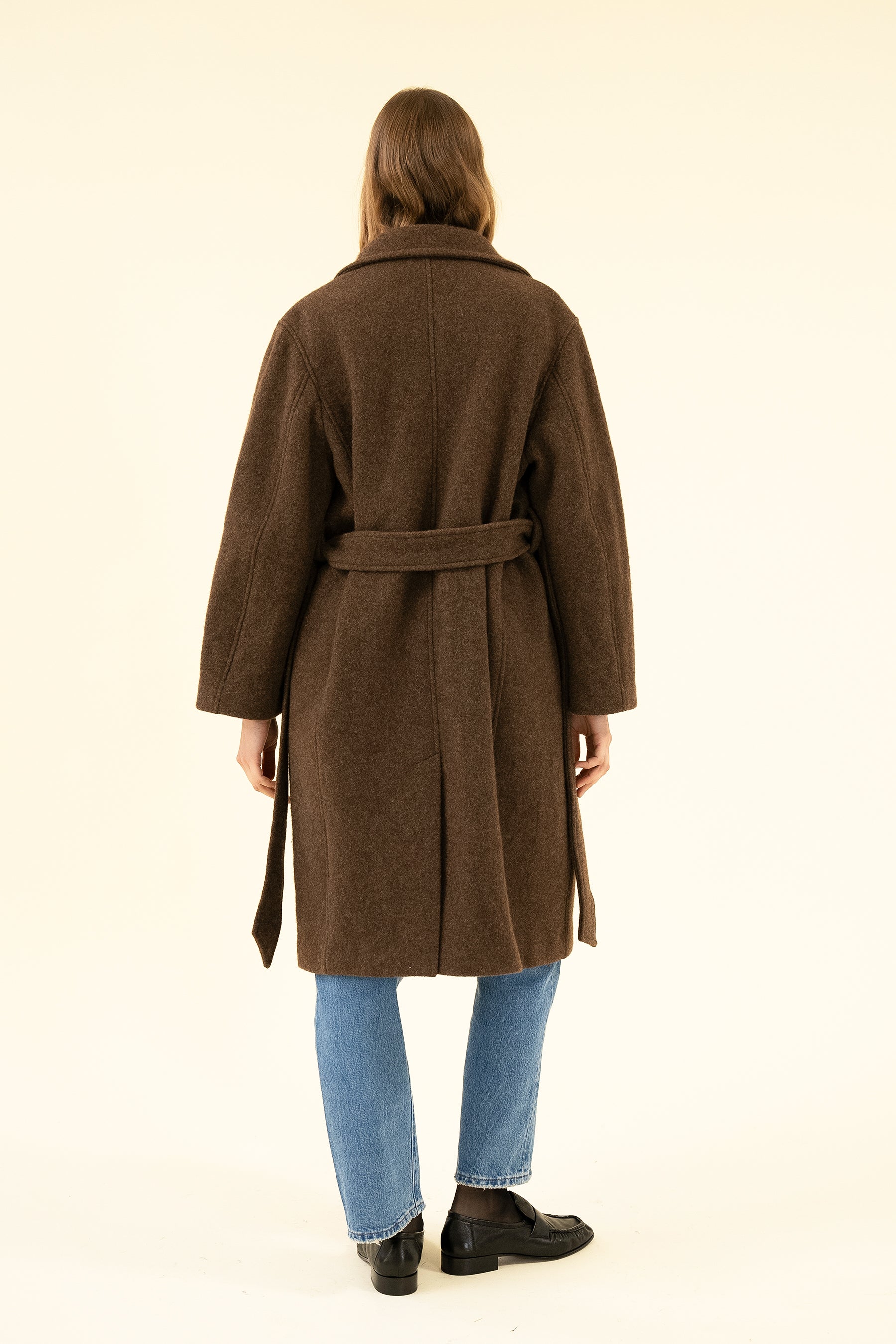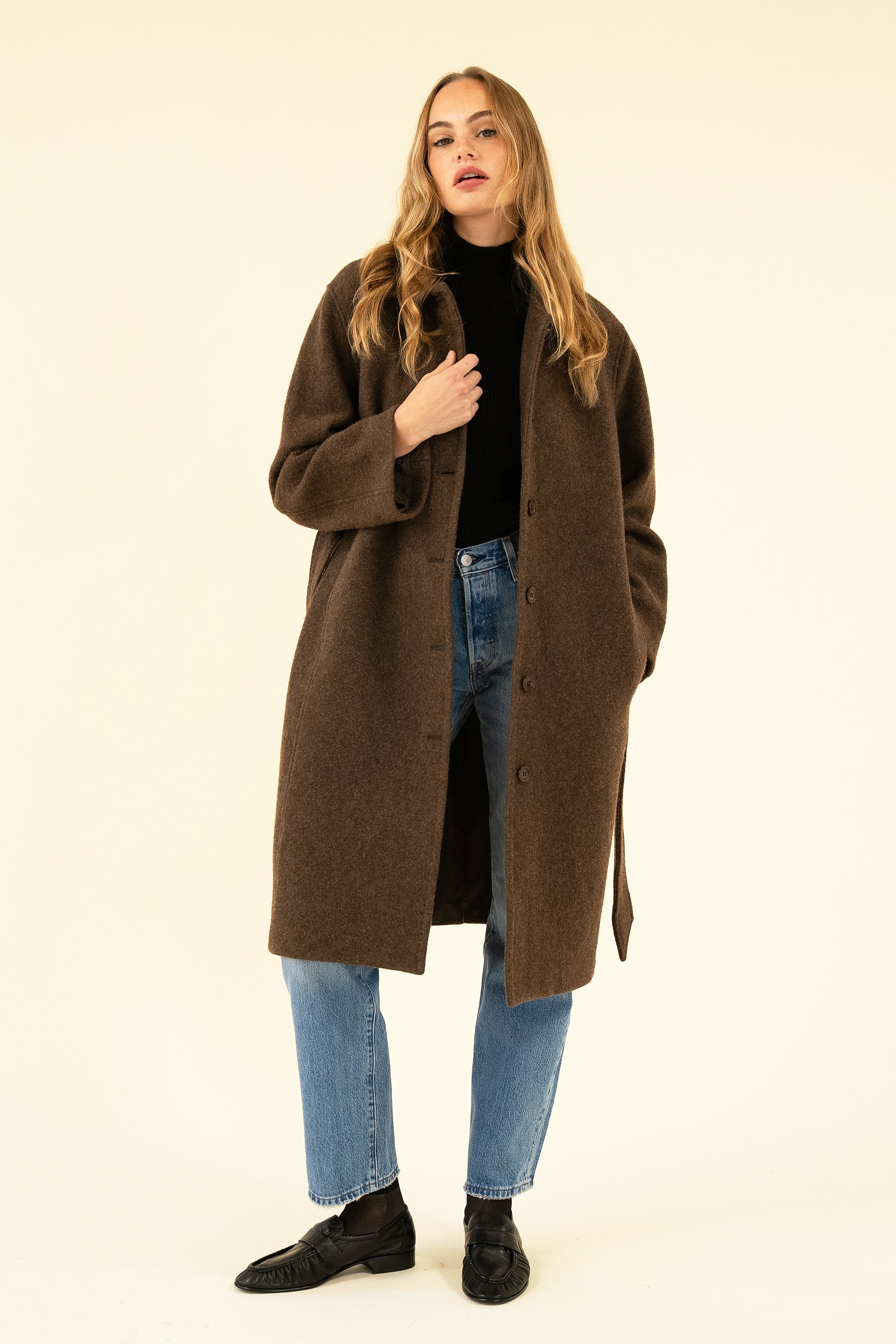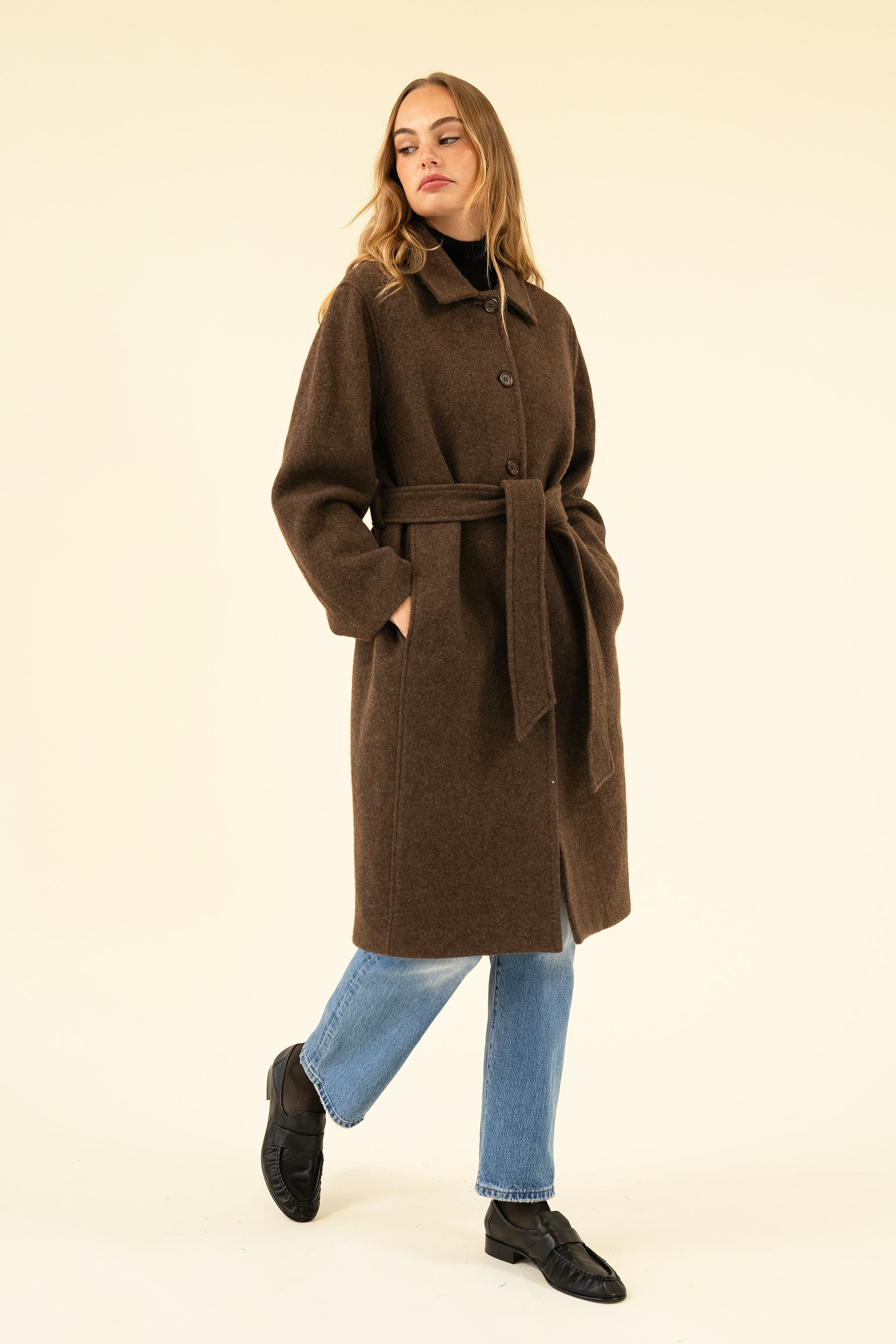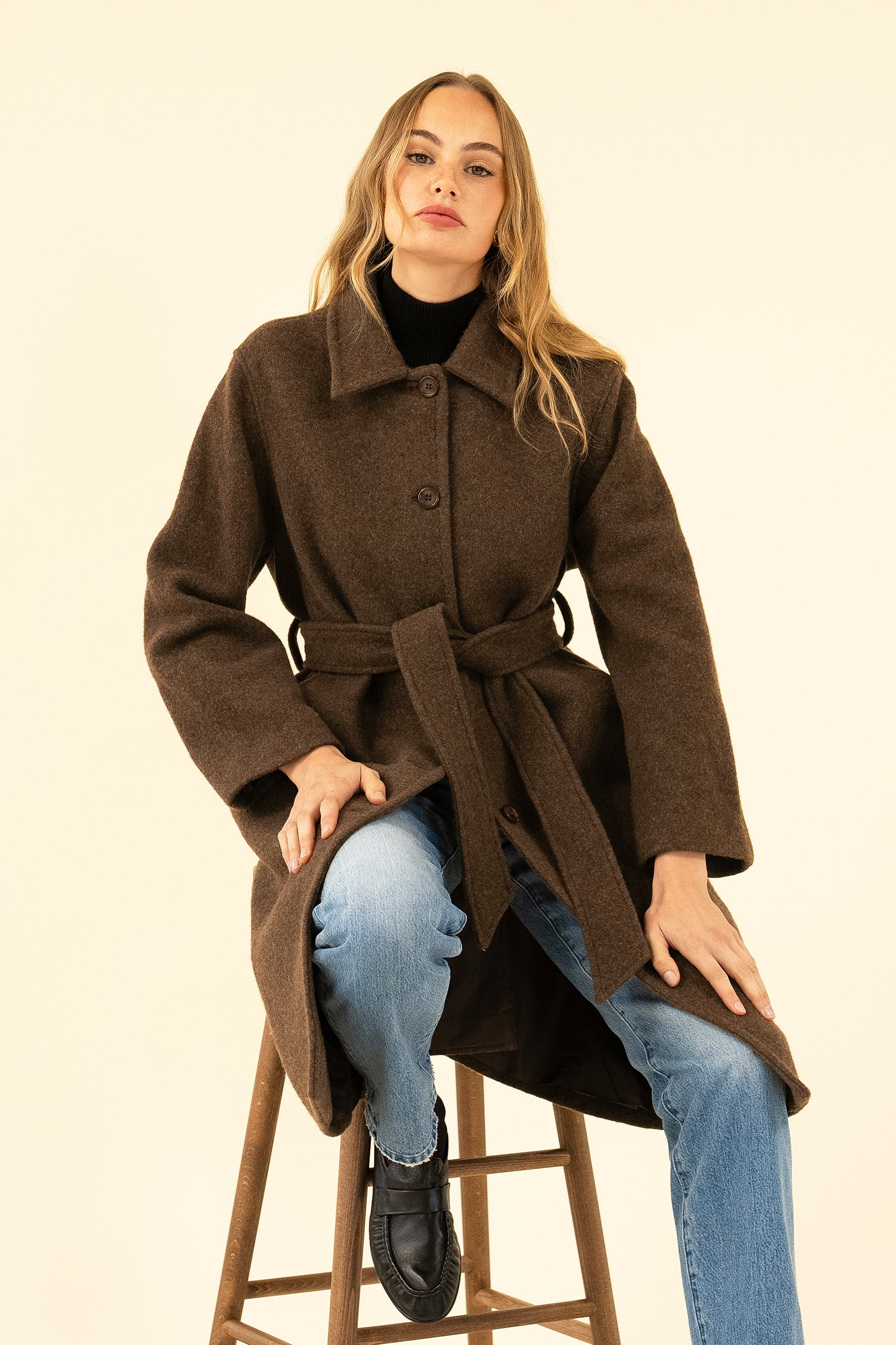 The Brianna has a button front and collar. Side pockets and a waist tie. She's perfect for keeping warm this winter and is made from 100% Bouclé Wool. Model wears size S and is 5'9 / 180cm.