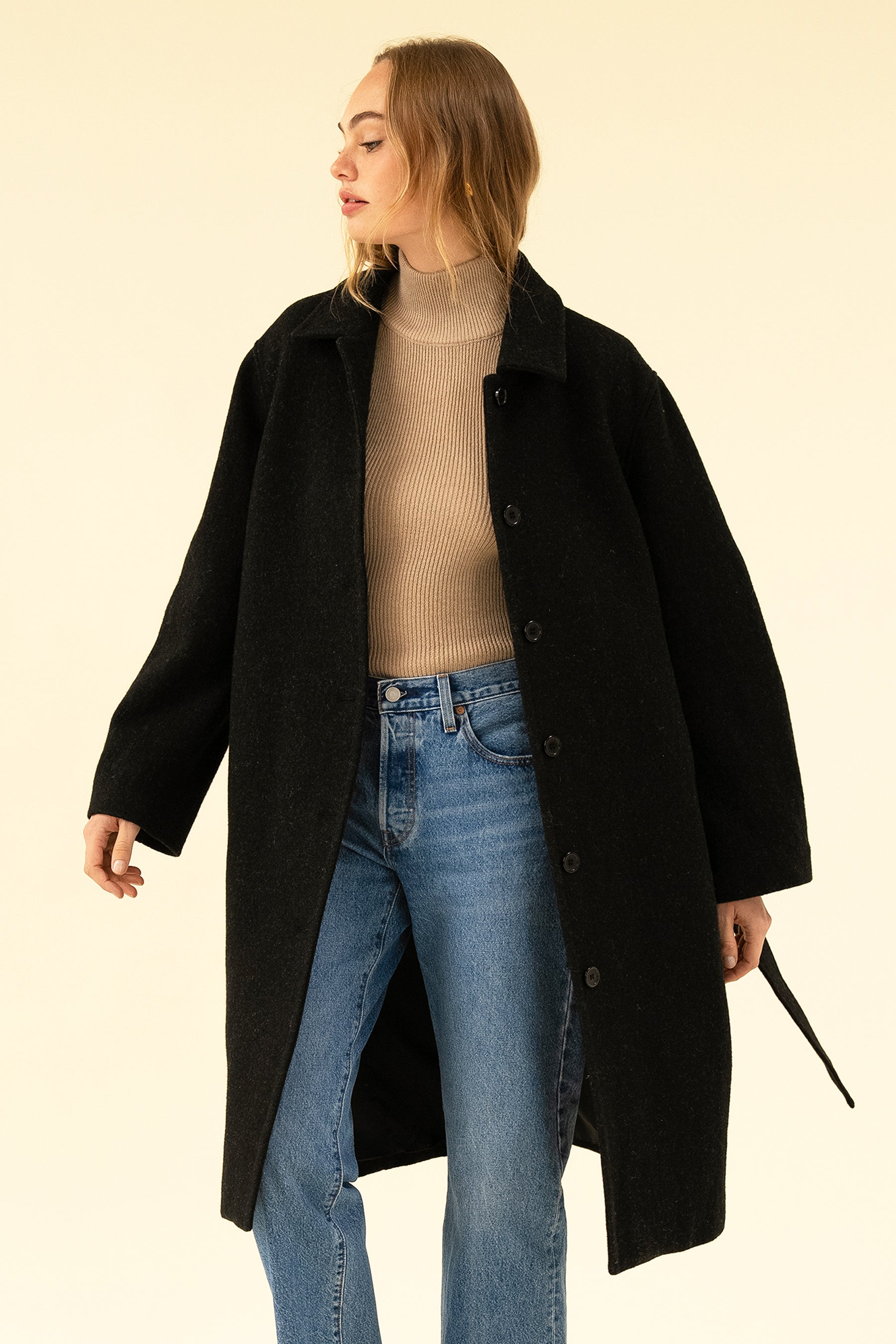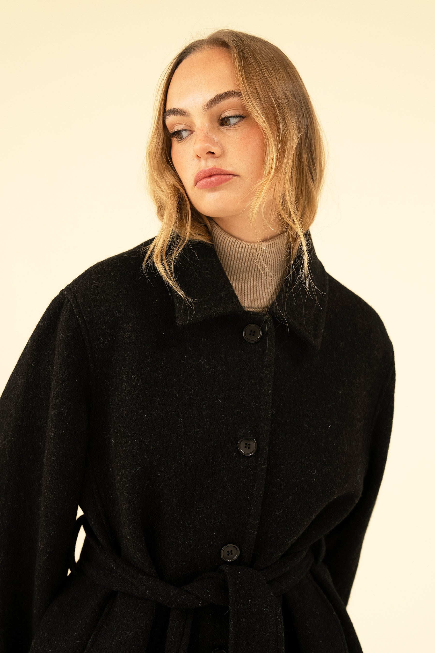 The Brianna has a button front and collar. Side pockets and a waist tie. She's perfect for keeping warm this winter, made from 100% Bouclé Wool. Model wears size S and is 5'9 / 180cm.