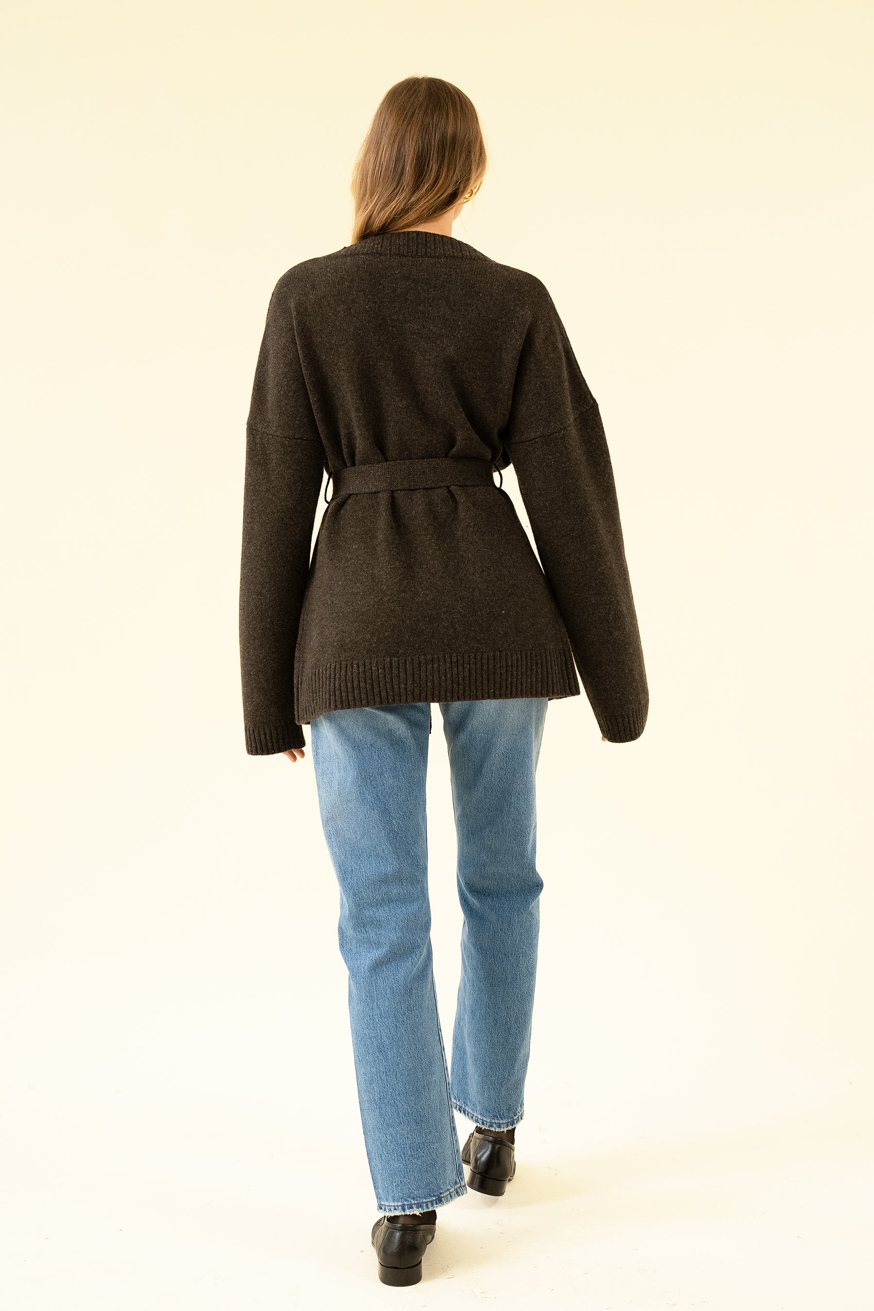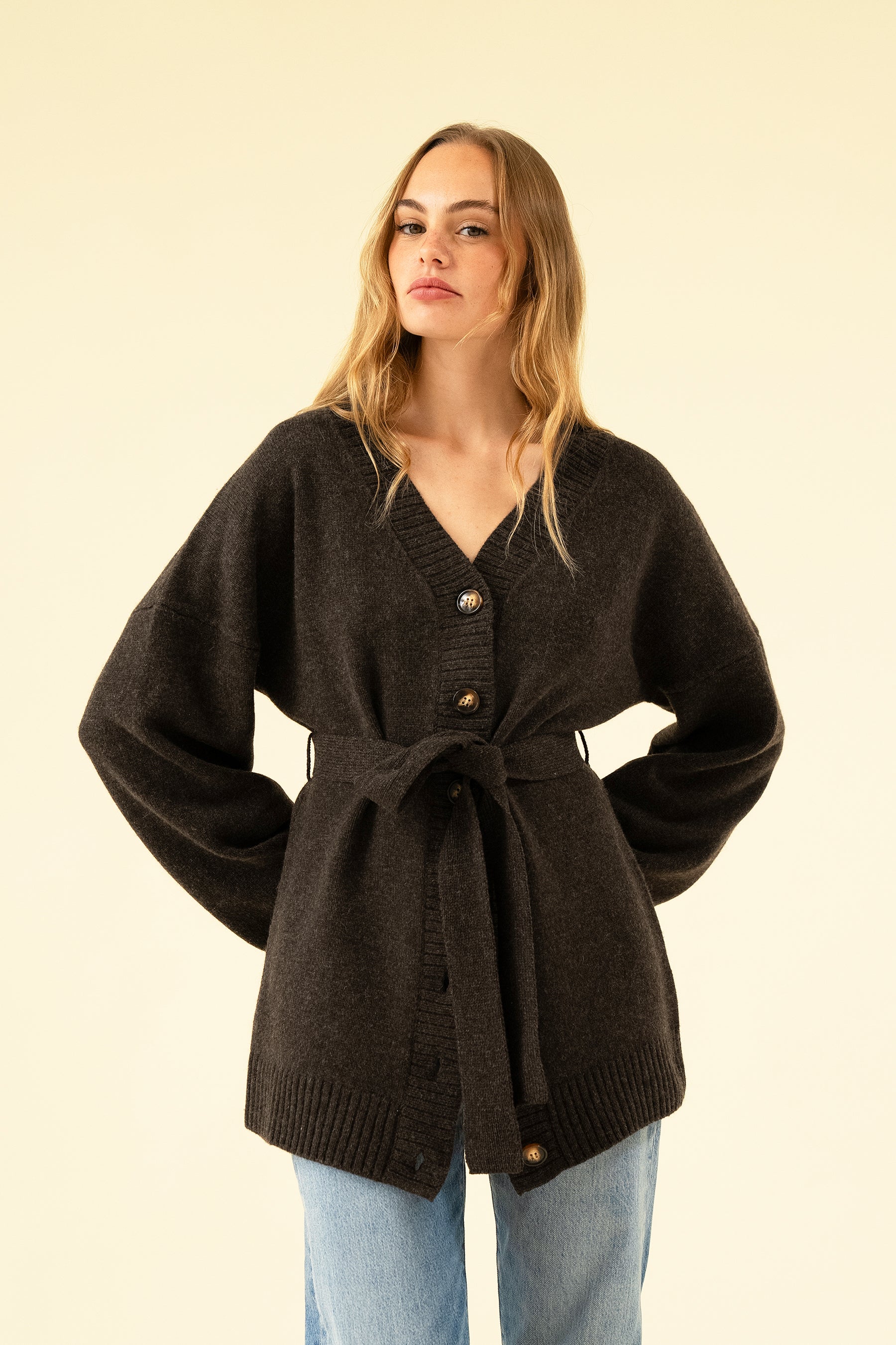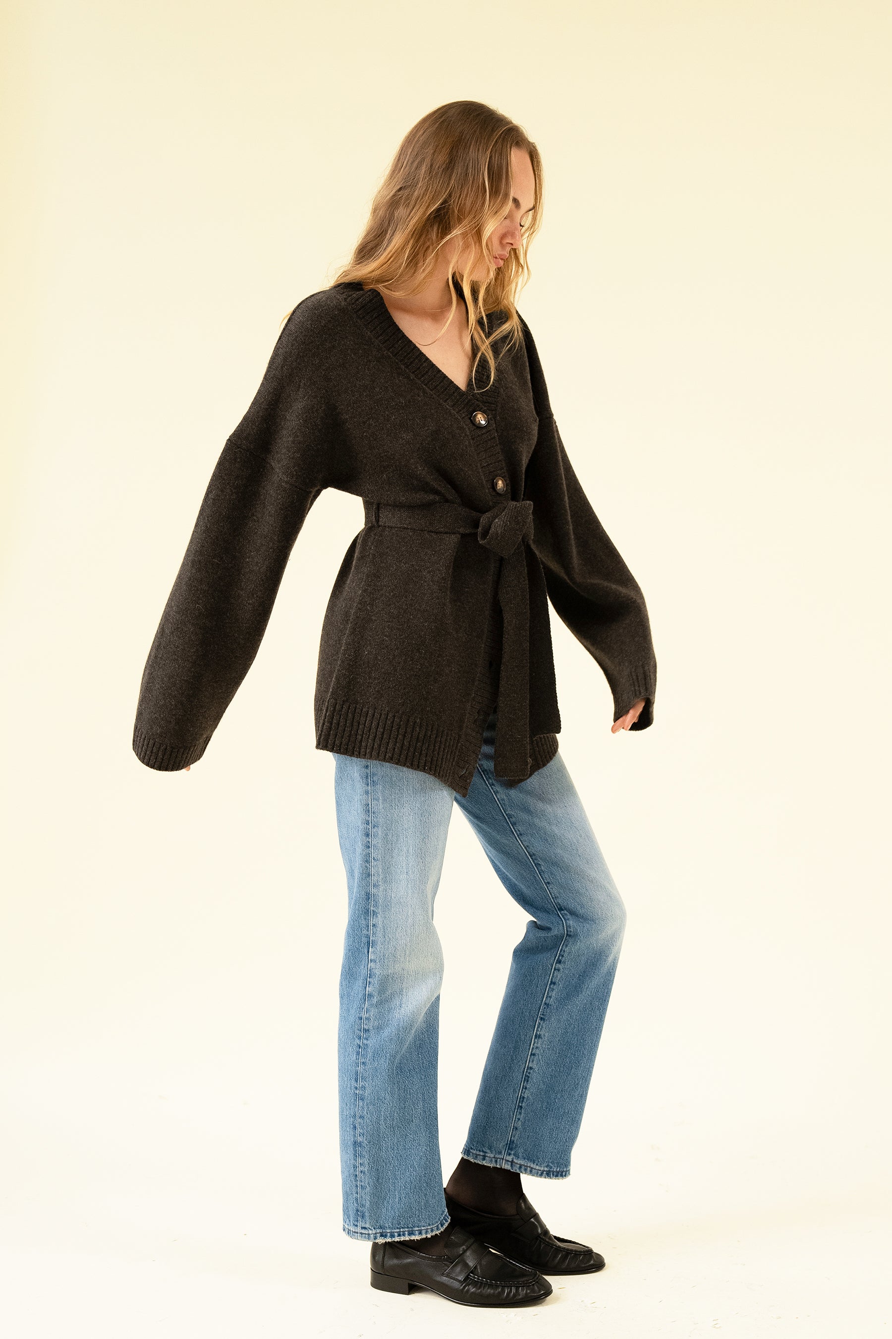 The Callie is a longline cardigan with a knitted waist tie. Cosy up in 100% RWS certified Merino Wool in a statement knit. Model wears size S, she is 5'9.