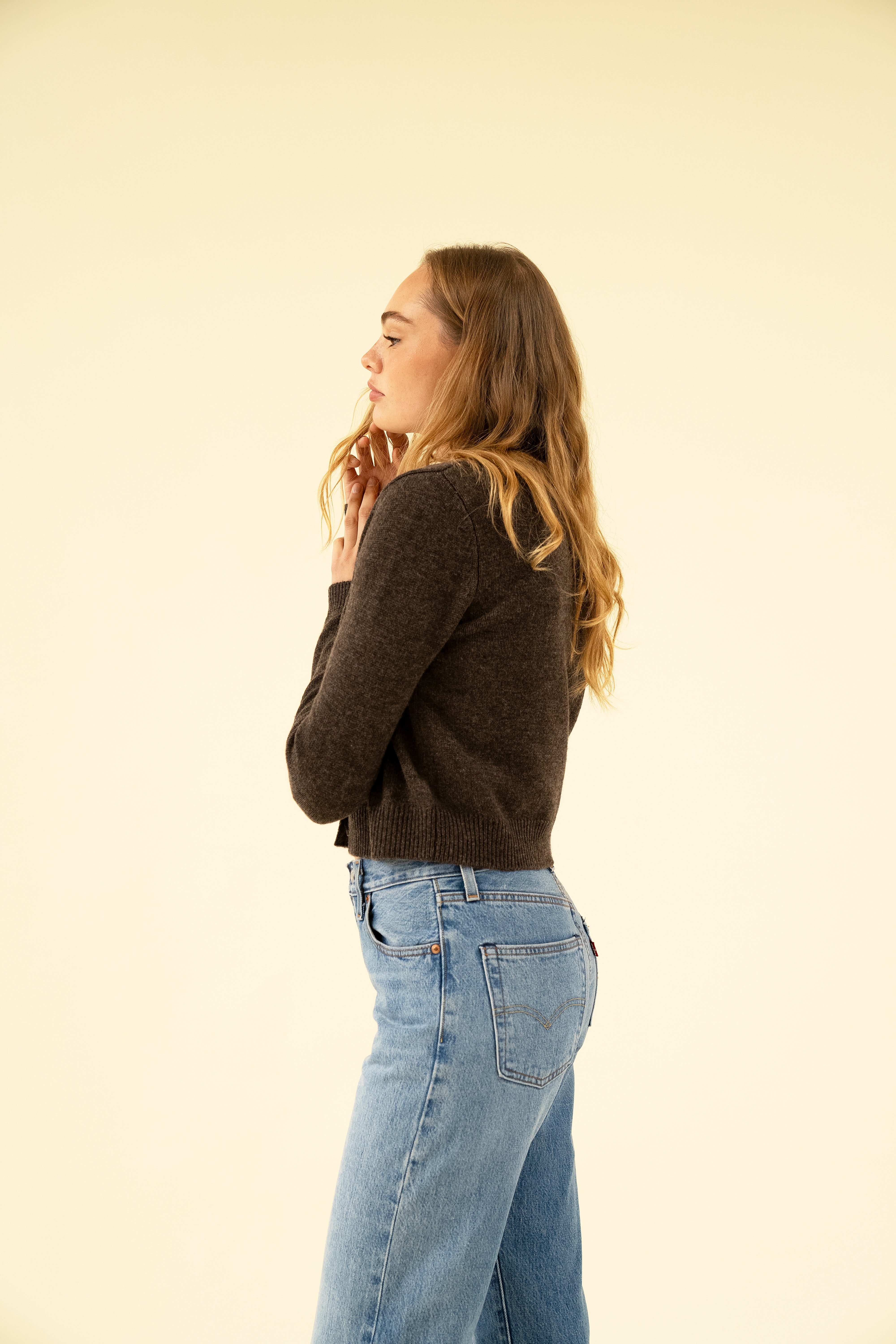 Charlotte is a simple crew cardigan with boxy fit. Made from a RWS Merino wool & Cashmere blend. Model wears size S and is 5'9.