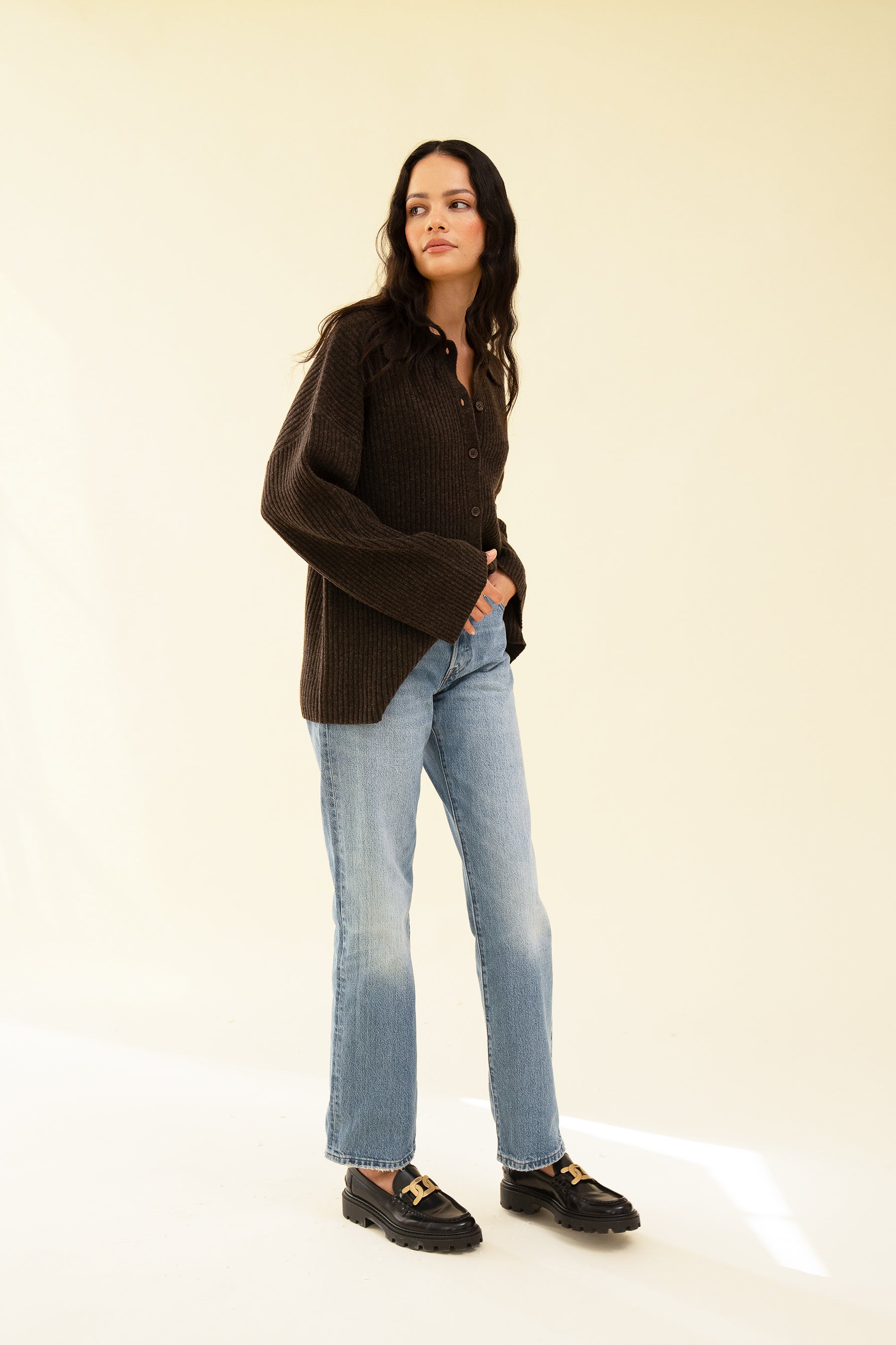 The Clio is the ultimate relaxed knit, she has a dropped shoulder and oversized fit with button front and collar. She's made from 100% RWS certified Merino Wool. Model wears size S, she is 5'9.