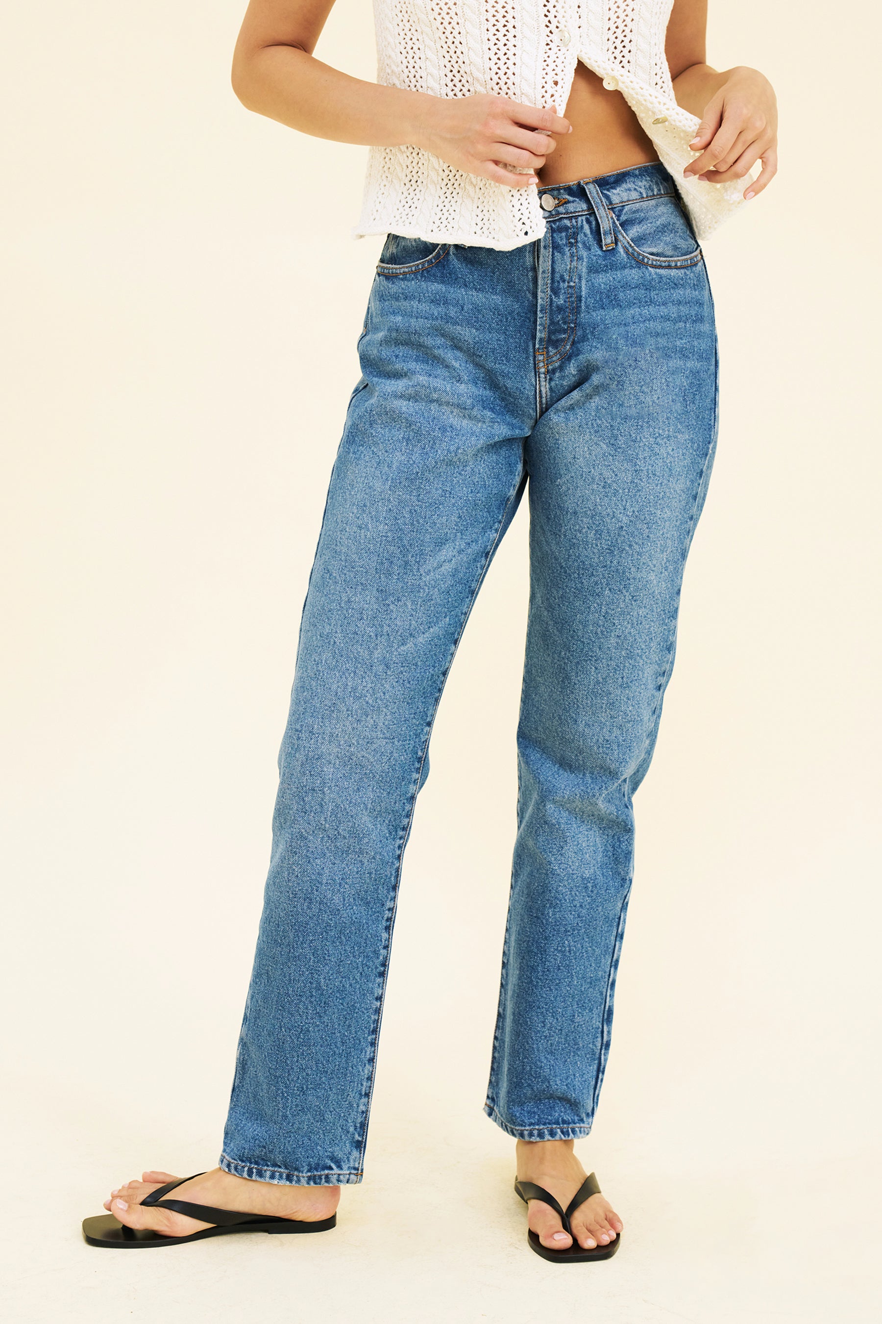 Introducing our Jennifer Jean, a 90s cut straight leg and classic mid blue jean. Non-stretch, highest quality 100% BCI cotton. Model is 5'8 and wears a 26 Regular.