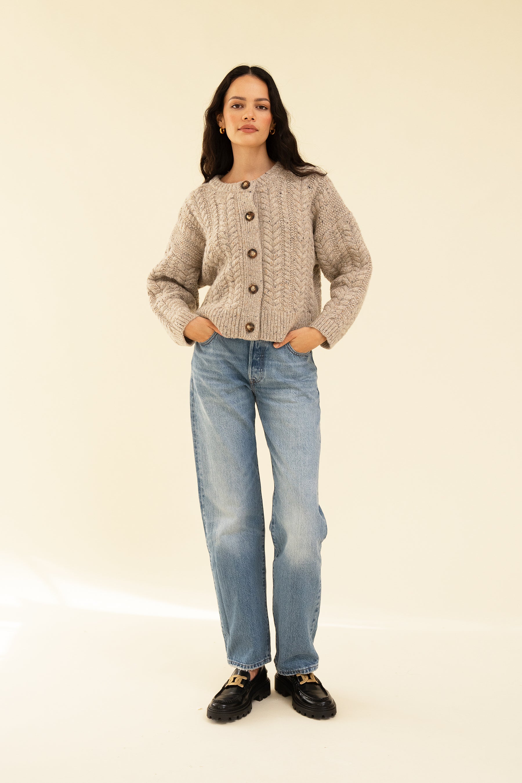 Our classic Sloan cardigan, made from RWS Merino wool, recycled Nylon and Alpaca for the highest quality knit. Wear her fully buttoned or over a fresh white tee for a clean fit with your favourite jeans. Model wears size M and is 5'9.