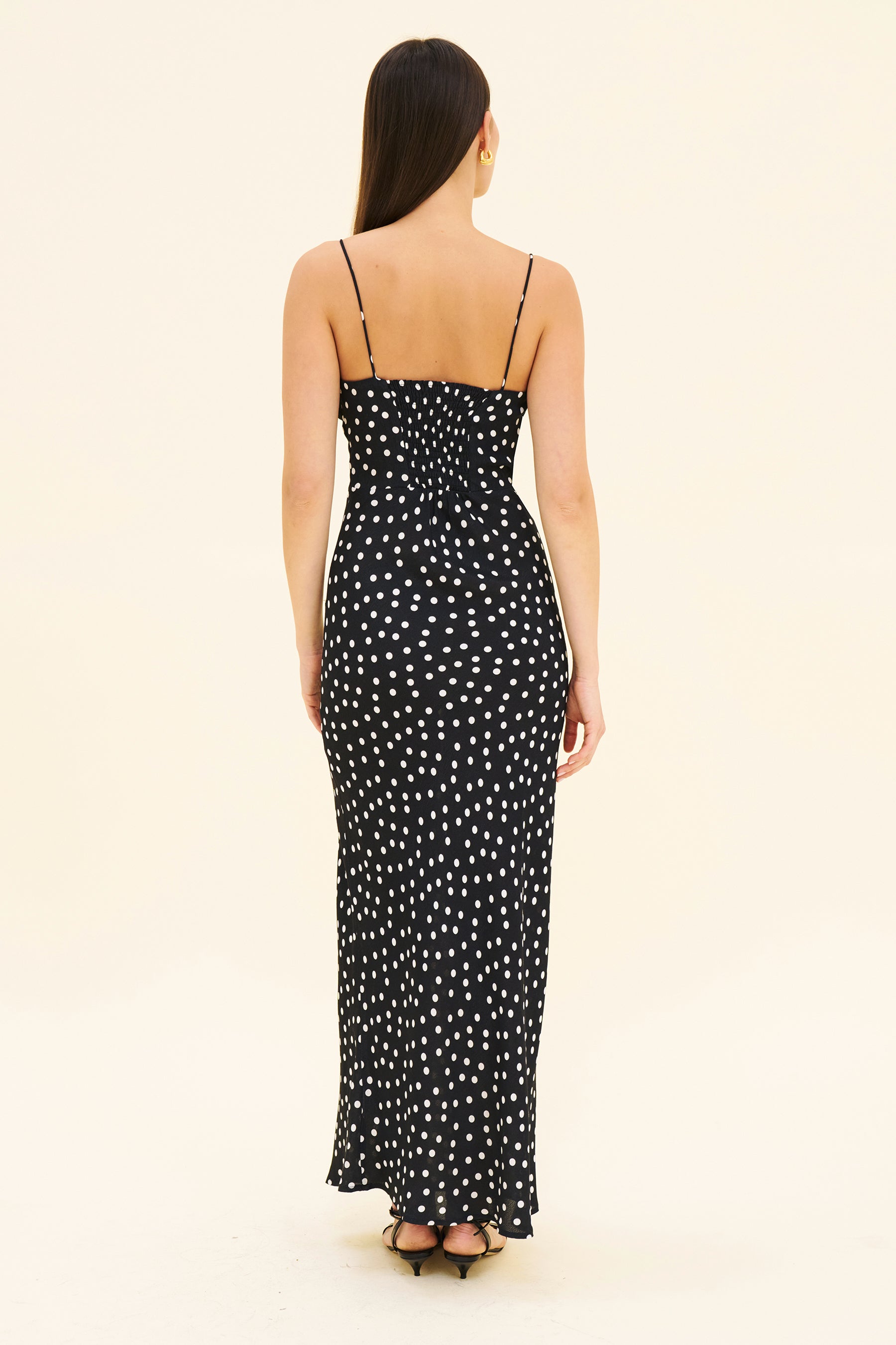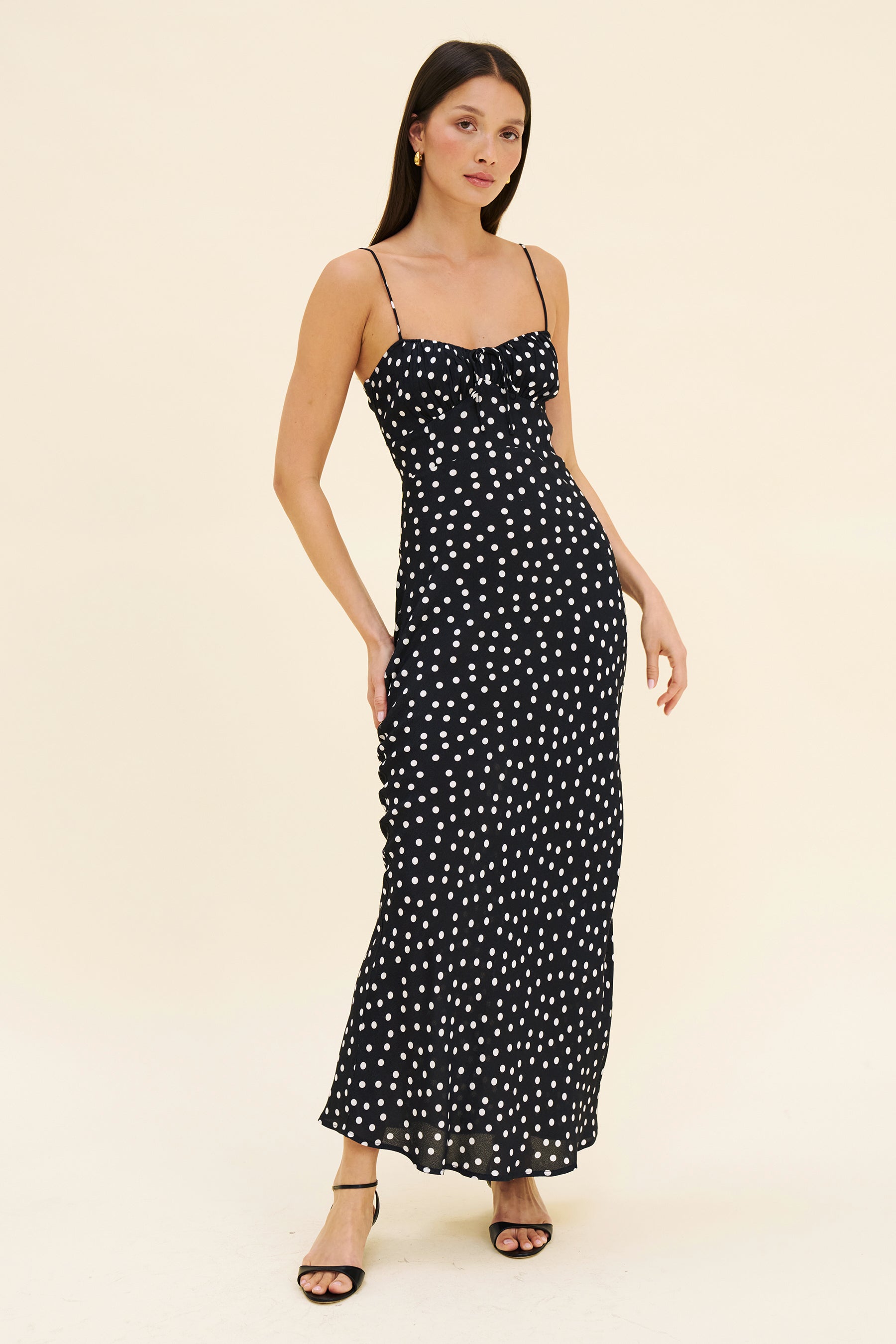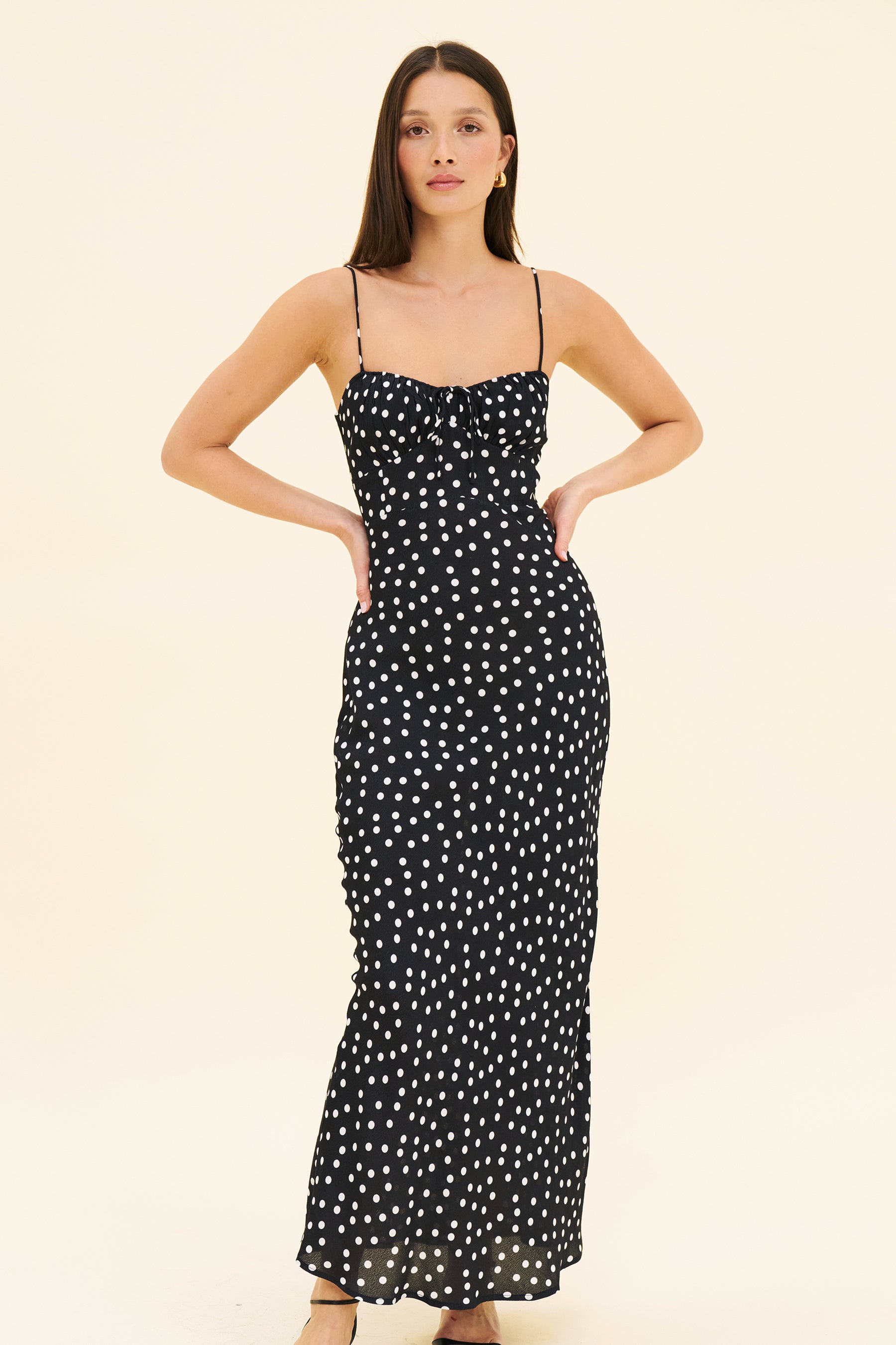 The Violet dress is a simple 90s style slip dress. A sweetheart neckline, adjustable tie at the bust and stretch panelling at the back. With a bias cut skirt to fall so flattering against the body. Model wears size S and is 5'8 / 173cm.