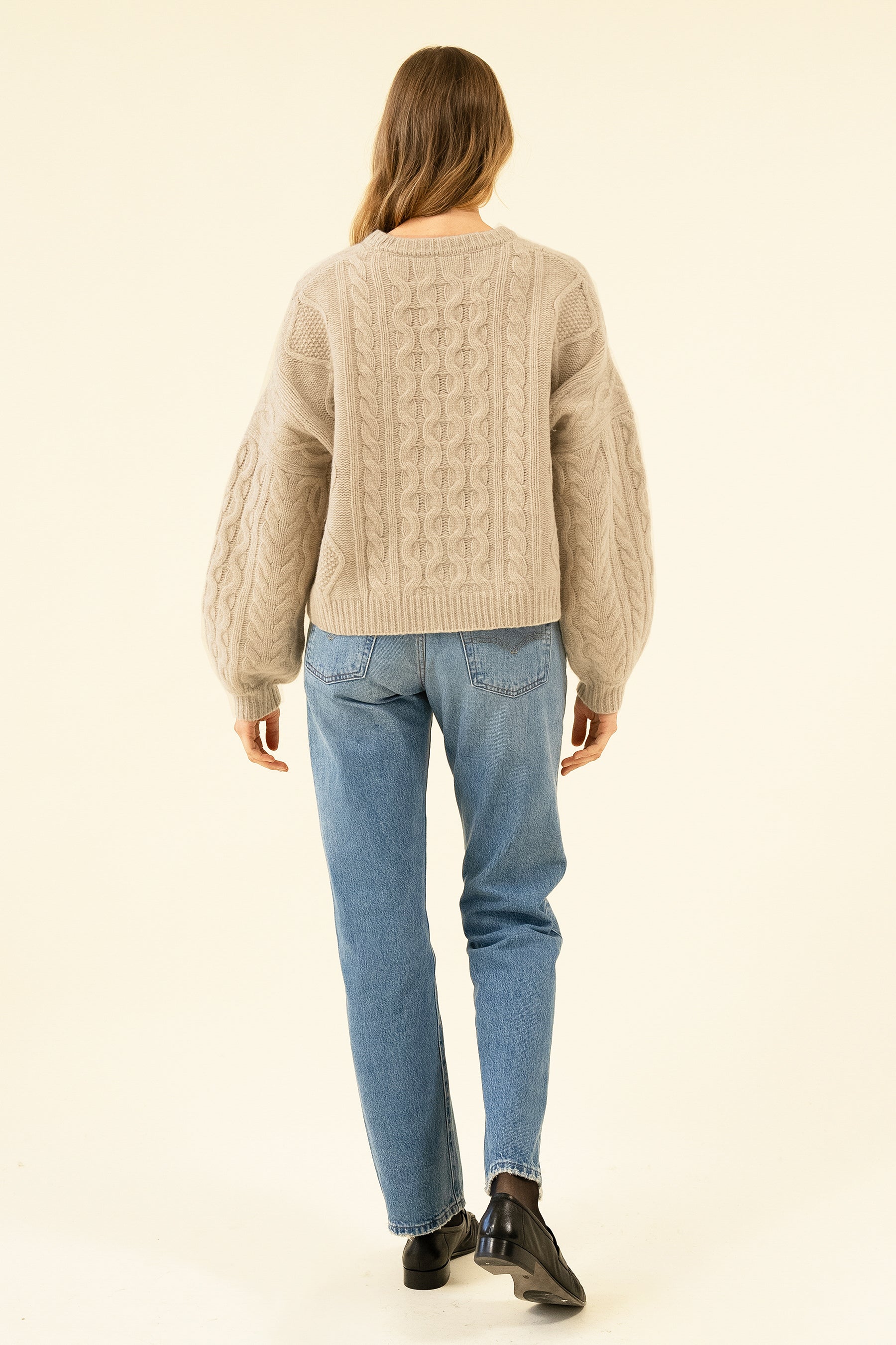 The perfect winter staple, cable knit and boxy with oversized sleeves. Cosy up in 100% RWS certified Merino Wool. Model wears size S, she is 5'9.