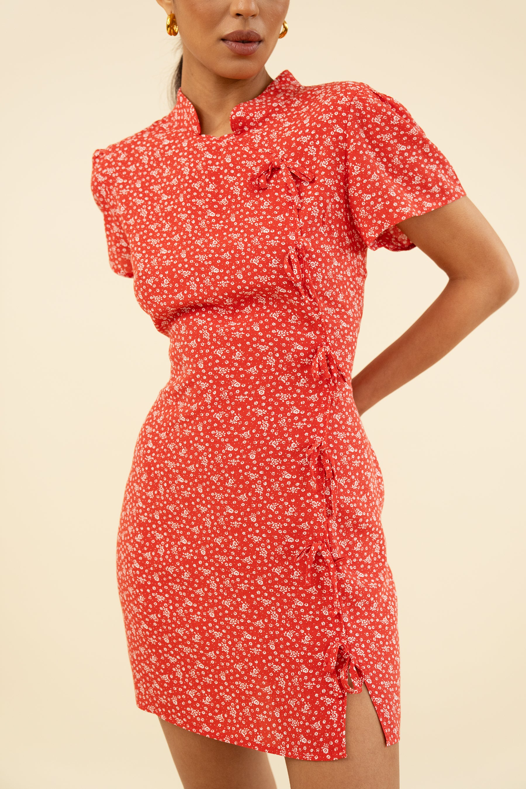 The Yua is Chinese inspired, the cutest tie details and textured fabric. Made from Viscose. Model wears size XS and is 5'9.