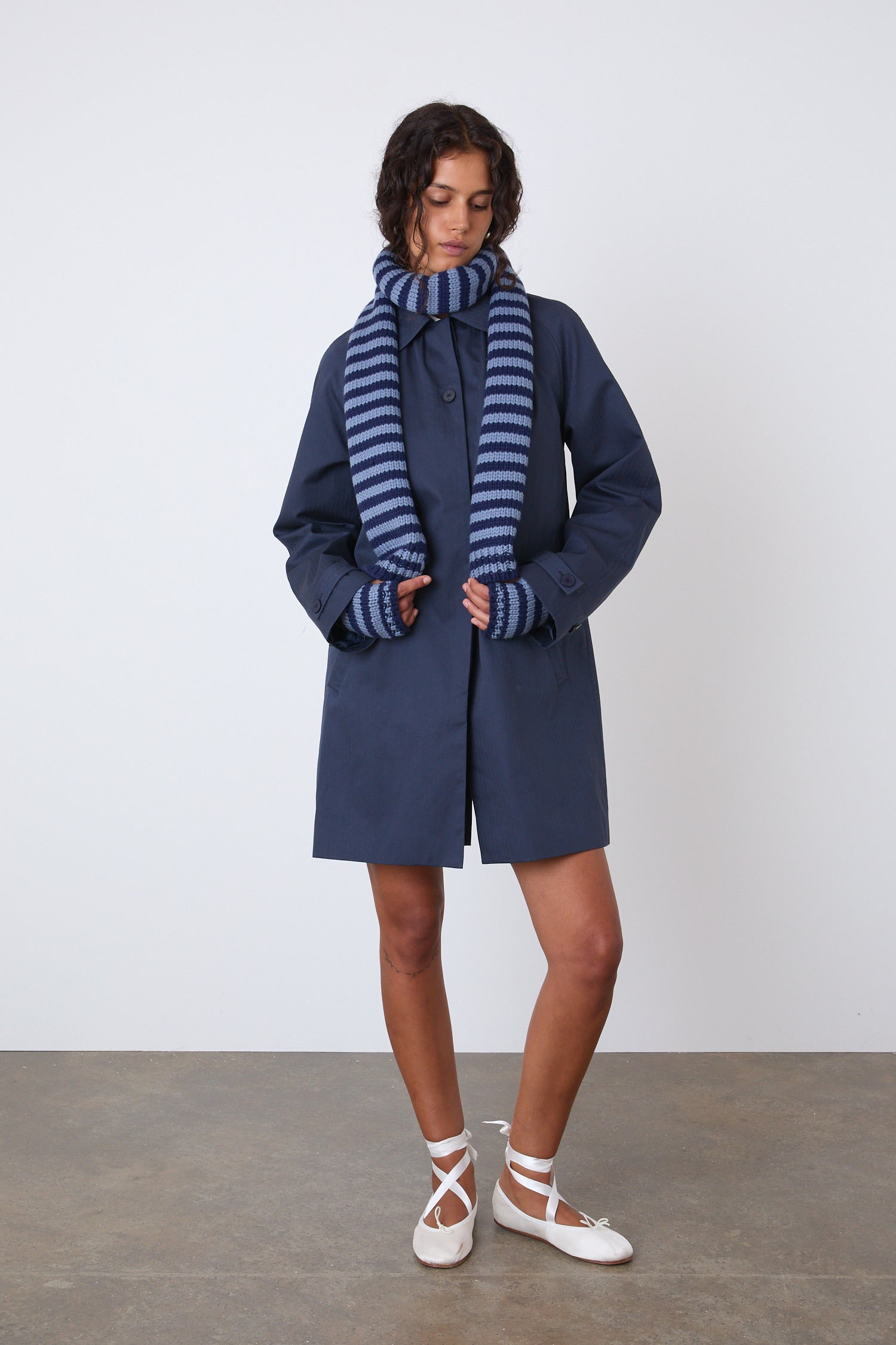 A mid-length trench coat with a feminine silhouette and soft gathering behind the collar.