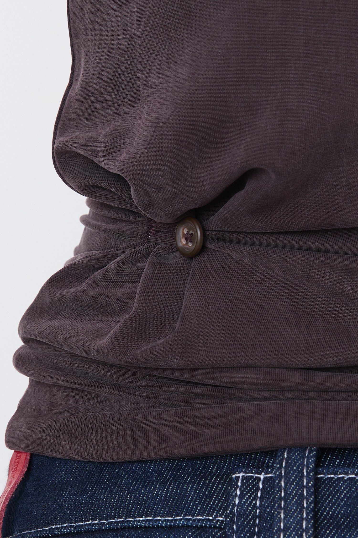 Features a delicate neckline drape, elongated sleeves with thumb loops, and optional waist cinching button detail.