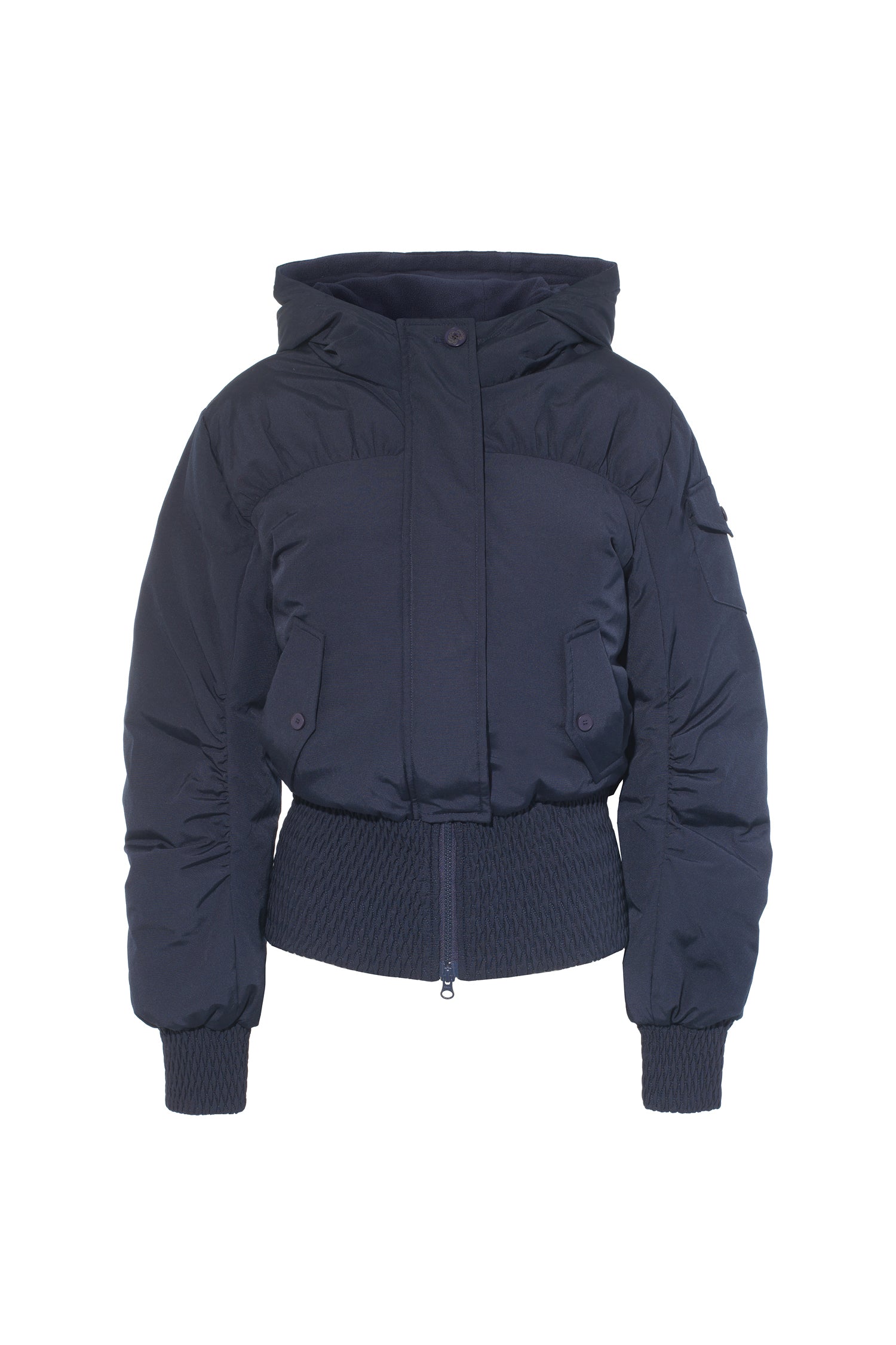 A hooded puffer jacket inspired by the jackets of the early 2000s, with a deep smocked waistband that cinches the waist.