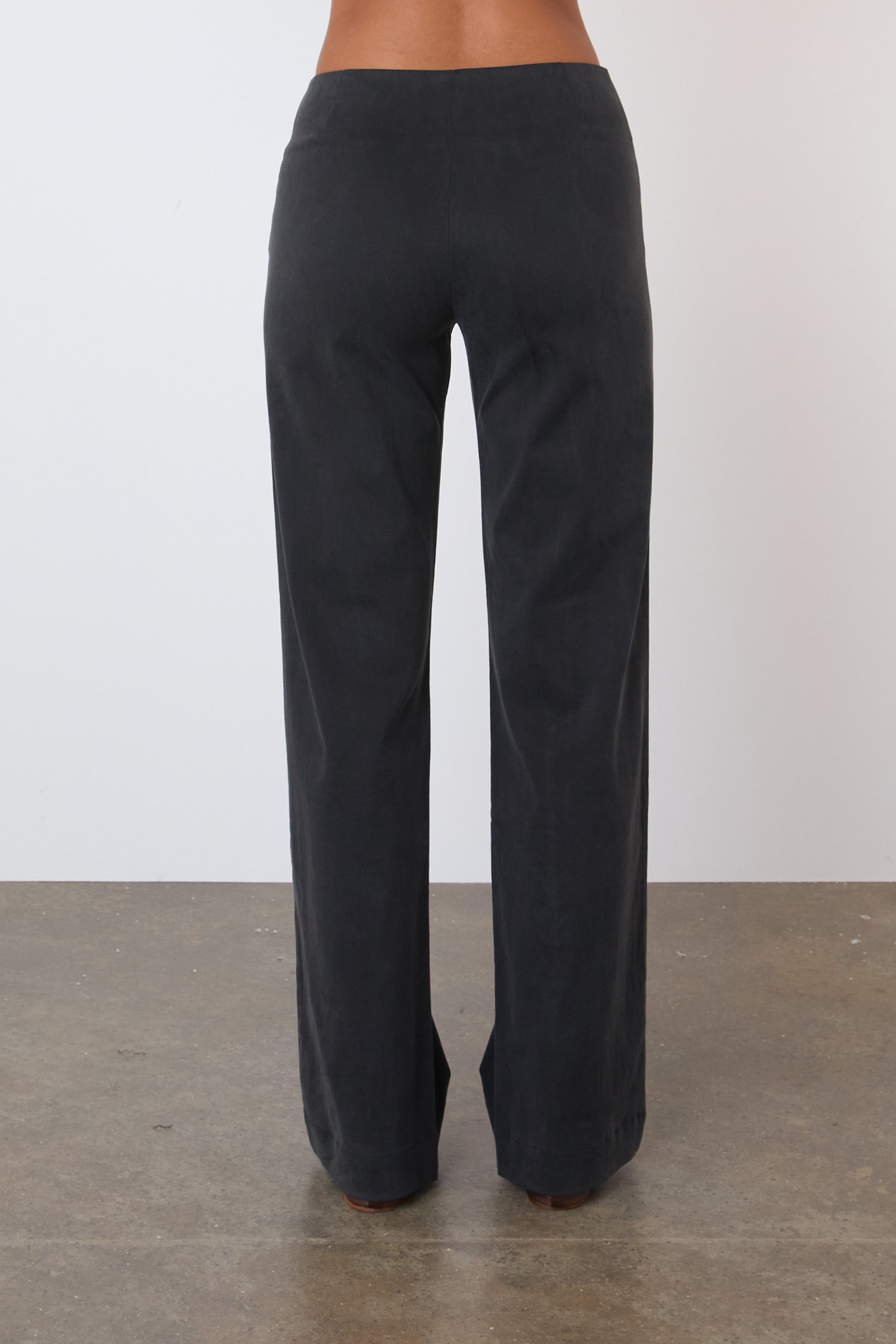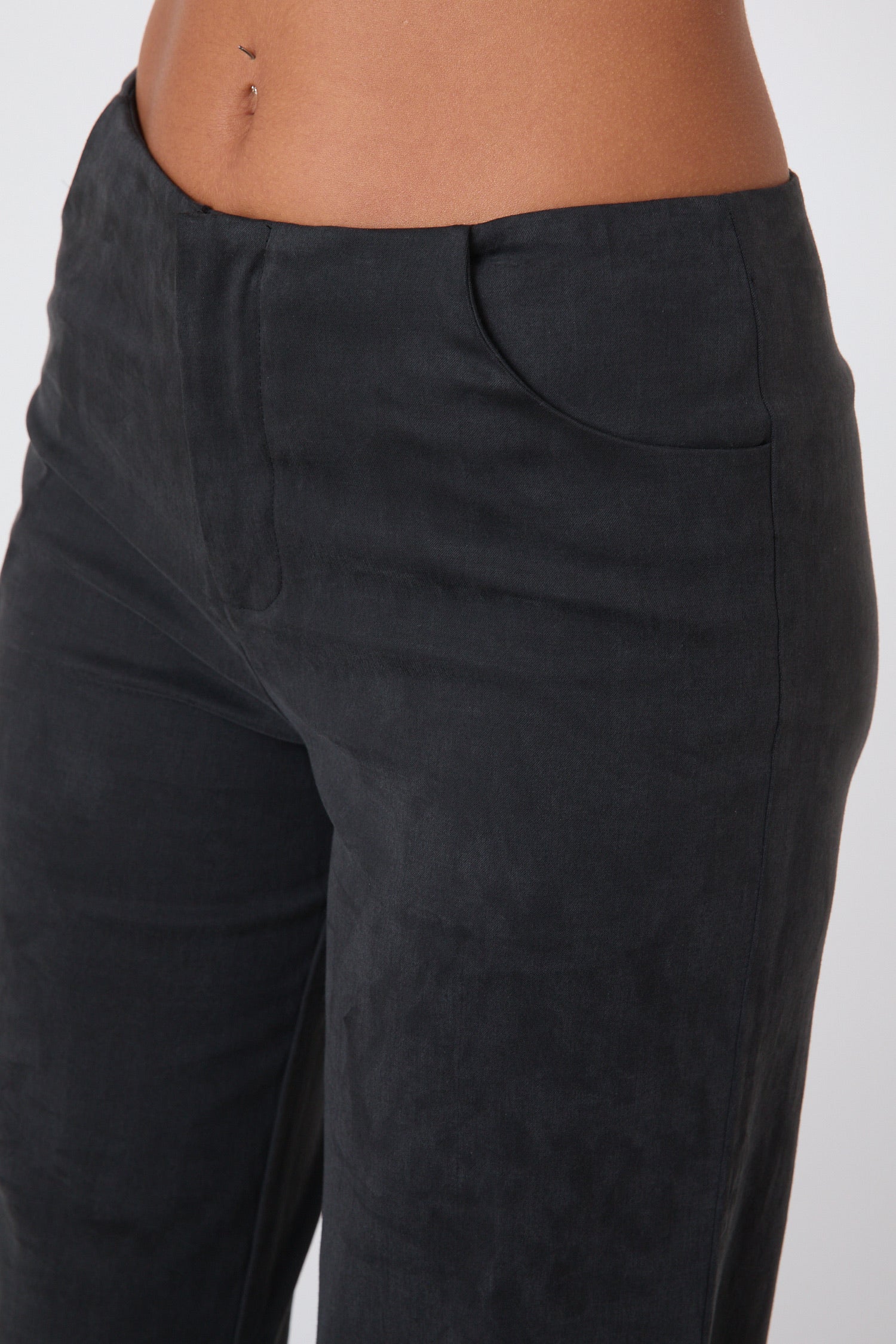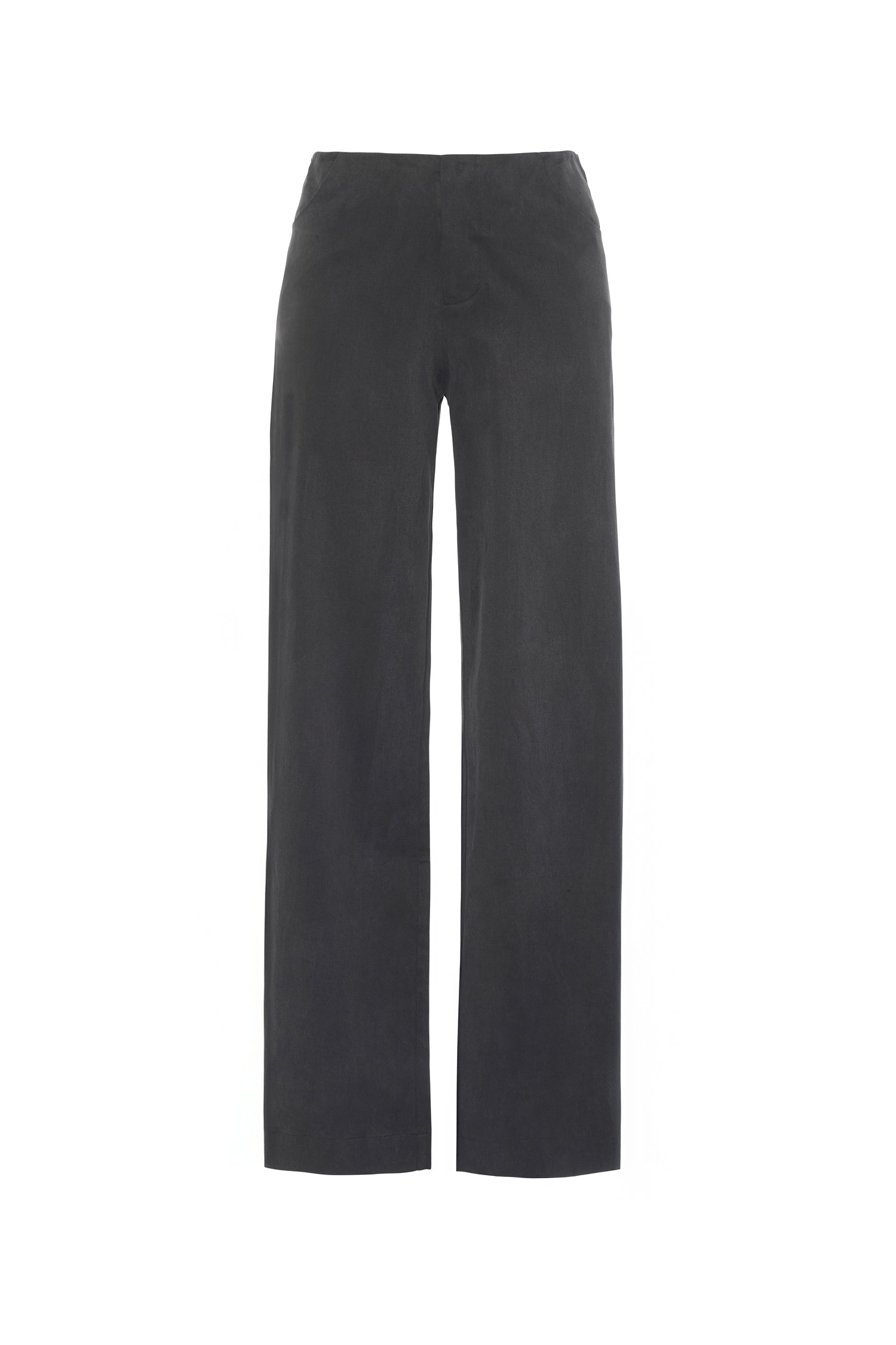 A fitted mid-rise, straight-leg trouser with a clean waistband, invisible hook-and-eye front closure, and front pockets.